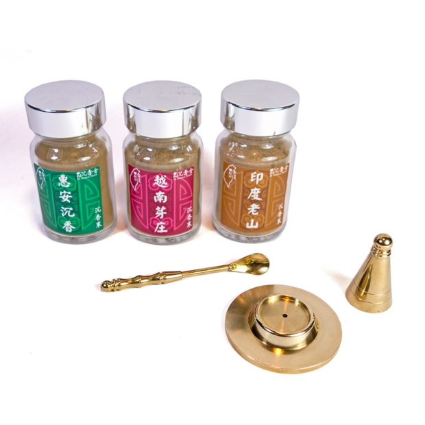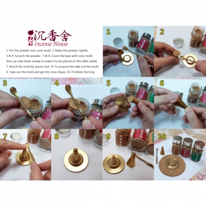 Incense Cone Tool Gift Set - Brass Cone Mold + Brass Spoon + Brass Base + 2 Agarwood Powder + Sandalwood Powder